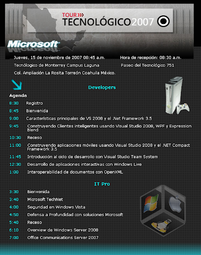 Pues después de haber terminado la votación por los temas del Tour Tecnológico ya está la agenda para el próximo jueves 15 de noviembre, pueden registrarse en esta dirección: Registro para el Tour Tecnológico 2007